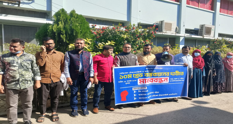 বক্তারা বলেন, স্বাস্থ্যসেবায় গুরুত্বপূর্ণ ভূমিকা থাকা সত্ত্বেও মেডিকেল টেকনোলজিস্ট ও ফার্মাসিস্টদের ন্যায্য দাবি—দশম গ্রেড এখনও বাস্তবায়িত হয়নি। দীর্ঘদিন ধরে দাবি জানানো হলেও কোনো অগ্রগতি না থাকায় পেশাজীবীরা হতাশ ও ক্ষুব্ধ। বর্তমানে ১০ম গ্রেড বাস্তবায়নের ফাইল জনপ্রশাসন মন্ত্রণালয়ে রয়েছে। বক্তারা হুঁশিয়ারি দেন, দ্রুততম সময়ের মধ্যে দাবি বাস্তবায়িত না হলে তারা লাগাতার কর্মবিরতি পালন করবেন।