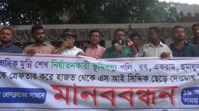 আগামী ২৪ ঘন্টার মধ্যে ভূমিদস্যুদের গ্রেপ্তার ও দাউদকান্দি থানার ঘুষখোর এসআই সিদ্দিকের বিচারের দাবিতে গতকাল জাতীয় প্রেসক্লাবের সামনে বাংলাদেশ জাতীয় সাংবাদিক সংস্থা ট্রাস্টের উদ্যোগে মানবন্ধন অনুষ্ঠিত হয়েছে।