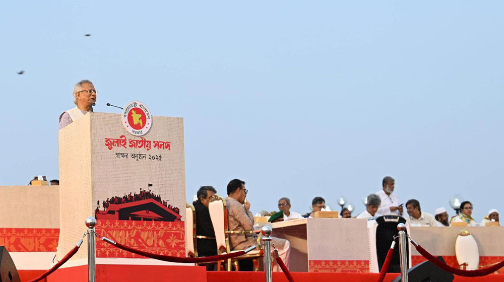 অন্তর্বর্তী সরকারের প্রধান উপদেষ্টা অধ্যাপক ড. মুহাম্মদ ইউনূস বলেছেন, জুলাই জাতীয় সনদ স্বাক্ষরের মাধ্যমে নতুন বাংলাদেশের সূচনা হয়েছে। এই সনদের ভিত্তিতে দেশকে সামনের দিকে এগিয়ে নিতে হবে।